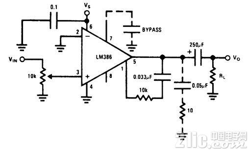 使用在引腳1和5之間的外部串聯(lián)RC電路和運(yùn)放器的并聯(lián)內(nèi)部151K電阻,對(duì)揚(yáng)聲器的低音響應(yīng)差補(bǔ)償。如果電阻是15K,穩(wěn)定運(yùn)行的最低值是10K,就可以得到6分貝的有效低音增強(qiáng)。