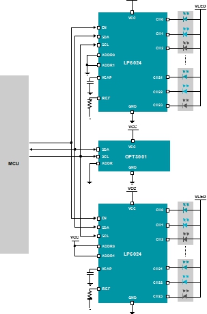 如圖 6 所示,各種LED 環(huán)形燈照明圖案參考設(shè)計說明了如何使用裝有集成式LED 引擎的新型多通道RGB LED 驅(qū)動器設(shè)計多色RGB LED 環(huán)形燈圖形子系統(tǒng)。使用環(huán)境光傳感器 IC 可自動控制LED 亮度。