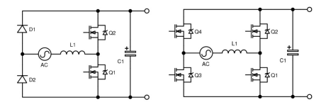 已經(jīng)采用線路同步MOSFET代替橋式二極管的方案,這種方案比較昂貴,并且需要專(zhuān)用的自供電控制器。業(yè)界已經(jīng)認(rèn)識(shí)到一種更好的解決方案是將主開(kāi)關(guān)也用作同步整流器,其中器件溝道被配置為僅從源極到漏極導(dǎo)通,這就是所謂“無(wú)橋圖騰柱”配置。如圖3(左)所示,通過(guò)重新排列組件能夠?qū)崿F(xiàn)這種配置。D5用類(lèi)似Q1的開(kāi)關(guān)代替,現(xiàn)在Q1和Q2用作升壓開(kāi)關(guān),同步整流器通過(guò)交流電源極性而實(shí)現(xiàn)交換功能。在這種配置中,只有一個(gè)二極管和開(kāi)關(guān)的RDS(on)形成電流串聯(lián),從而顯著降低了傳導(dǎo)損耗。