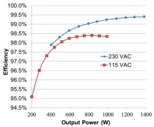 圖5:使用SiC共源共柵實(shí)現(xiàn)的無(wú)橋圖騰柱PFC級(jí)效率。