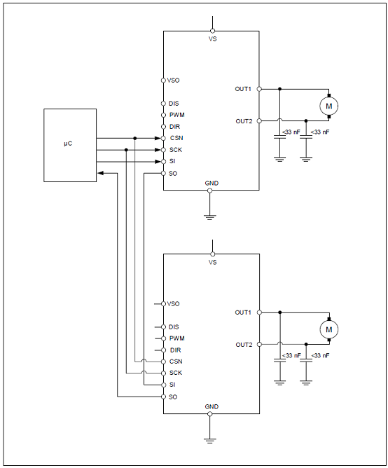 圖2.IFX9201SG帶SPI接口的H橋應(yīng)用電路圖