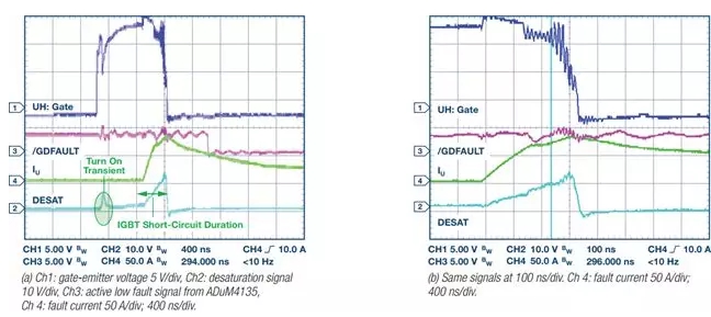 柵極驅(qū)動器去飽和檢測比上文描述的過流檢測方法執(zhí)行速度快得多,且對于限制短路電流所允許上升的上限很重要,從而提升了系統(tǒng)的整體穩(wěn)定性,并超過了可以實現(xiàn)的水準,哪怕系統(tǒng)帶有快速過流保護功能。這顯示在圖7中。當(dāng)發(fā)生故障時,電流快速上升——事實上,電流遠高于圖中所示,因為圖中以帶寬限制20 A電流探針進行測量,僅供參考。去飽和電壓達到9 V跳變電平,柵極驅(qū)動器開始關(guān)斷。顯然,短路的整個持續(xù)時間不足400 ns。電流的長尾表示下方IGBT反并聯(lián)二極管中的續(xù)流導(dǎo)致的感應(yīng)電能。開啟時,去飽和電壓的初始增加是雜散去飽和檢測電動勢的一個例子,這是由于集電極-發(fā)射極電壓瞬態(tài)所導(dǎo)致。可以通過增加去飽和濾波器時間常數(shù),從而增加額外的消隱時間而消除。