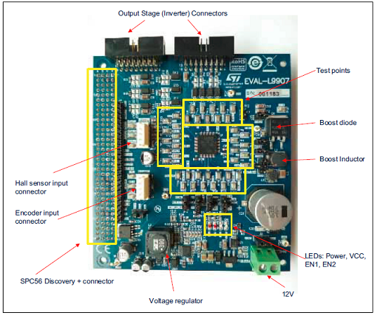 Standard connectors connect the gate driver board (L9907) and Inverter Power MOSFET output stage; this solution allows simplifying the evaluation procedure and it increases the flexibility of the HW environment.