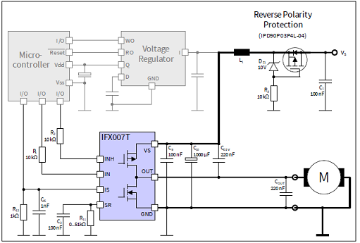 圖2. IFX007T應(yīng)用電路:兩個IFX007T組成H橋