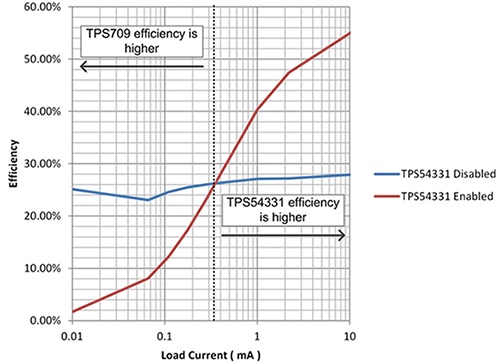 盡可能請注意,從10μA負(fù)載電流到10 mA,TPS709的效率將保持大致恒定在27%(VOUT/VIN)。當(dāng)TPS54331使能時,由于空載輸入電流,它將以非常低的效率啟動,但很快就會升高,在較高的負(fù)載電流下達(dá)到90%以上。當(dāng)TPS54331使能時,TPS709不提供任何負(fù)載電流,因此可以忽略其接地電流。由此可以清楚地看出,當(dāng)輸出負(fù)載電流為350μA或更低時禁用TPS54331將是有益的。
