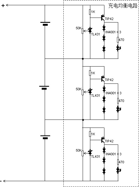 | 這個(gè)均衡電路用的是三個(gè)一模一樣的并聯(lián)穩(wěn)壓電路組成的,每個(gè)電池上并一個(gè)。