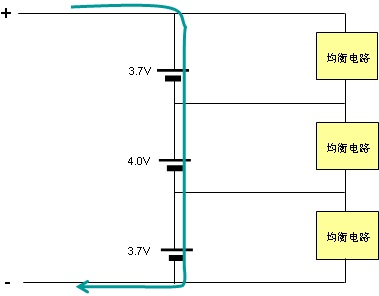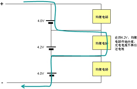 每個(gè)穩(wěn)壓電源都調(diào)節(jié)到4.2V。均衡的原理是,當(dāng)電池電壓都小于4.2V時(shí),并聯(lián)穩(wěn)壓電路不起作用,充電電流都從電池上通過(guò):