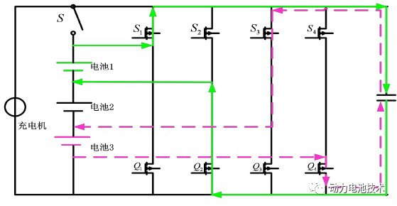 充電過程中,開關(guān)管 S 閉合,充電機給電池組充電。此時電池組右側(cè)開關(guān)管全部斷開,均衡系統(tǒng)不開啟。設(shè)單體電池B1 電壓開始明顯高于其他電池并達到均衡閾值時,此時均衡系統(tǒng)開啟,S1、Q2開關(guān)管閉合,電感與單體電池 B1 并聯(lián),起到分流的作用,電感儲存來自充電機與電池 B1 的能量;當 S1、Q2 開關(guān)管置 0,Q3、S4 開關(guān)管置 1 時,電感給充電過程的單體電池 B3 釋放一定能量。