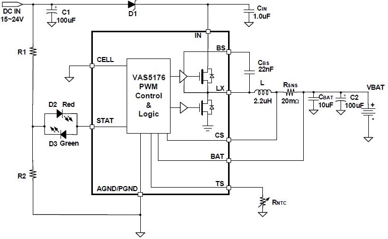 VAS5176 是一款8.5V-24V 輸入,高度集成的開關型鋰離子/聚合物電池充電芯片, 以高精度調節(jié)2A充電電流,和電池電壓。它密切監(jiān)測電池組的溫度只在設置安全溫度范圍下允許充電,還提供電池檢測、預充電調節(jié)、充電飽充和充電狀態(tài)指示等功能。熱反饋調節(jié)可降低充電電流并維持芯片內部溫度以不超過125°C 的條件下工作,如果結溫超過155°C,它將進行過熱關斷保護,停止工作以確保可靠度。