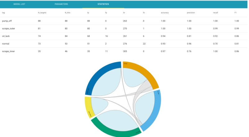 在任何時候,都可以創(chuàng)建異常模型或事件識別模型。事件識別模型是一個圓形的混淆矩陣,它允許 OtoSense 用戶探索混淆事件。