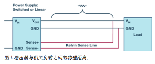 圖 1 顯示電源和負(fù)載之間存在電阻。可以通過略微提高電源 生成的電壓,來補(bǔ)償該電阻上的電壓損耗。不幸的是,線路 電阻上產(chǎn)生的電壓降取決于負(fù)載電流,即流過線路的電流。 相較于低電流,高電流會(huì)導(dǎo)致更高的電壓降。因此,負(fù)載由 精度相當(dāng)?shù)偷恼{(diào)節(jié)電壓供電,而調(diào)節(jié)電壓取決于線路電阻和 相應(yīng)的電流。