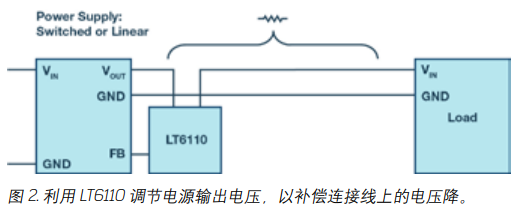 無需額外的一對(duì)檢測(cè)引線,也可以對(duì)電源和負(fù)載之間連接線上 的電壓降進(jìn)行補(bǔ)償。對(duì)于一些電纜布線復(fù)雜、成本高昂并且所 產(chǎn)生的 EMC 干擾很容易耦合到電壓測(cè)試引線的應(yīng)用而言,這一 點(diǎn)特別有意義。第二種方案是使用 LT6110 這類專用線路壓降補(bǔ) 償 IC。將此 IC 插入電壓發(fā)生側(cè),并測(cè)量進(jìn)入連接線之前的電流。 然后根據(jù)測(cè)得的電流來調(diào)節(jié)電源的輸出電壓,從而能夠非常精 確地調(diào)節(jié)負(fù)載側(cè)電壓,而不用考慮負(fù)載電流。