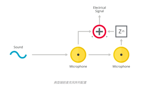通過(guò)在所需聲源的方向布置一行麥克風(fēng)構(gòu)造端射麥克風(fēng)陣列,此時(shí)所需聲音會(huì)以不同的時(shí)間延遲到達(dá)各個(gè)麥克風(fēng)。每個(gè)麥克風(fēng)的處理電路都可以通過(guò)電子時(shí)間延遲補(bǔ)償麥克風(fēng)的音頻時(shí)間延遲。端射麥克風(fēng)陣列和垂射麥克風(fēng)陣列相似,因?yàn)閬?lái)自所需方向的信號(hào)能夠積極求和,但來(lái)自其他方向的信號(hào)求和值則較低。