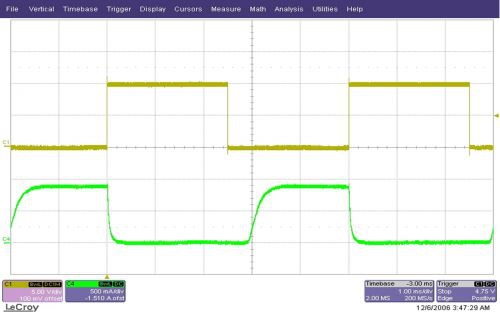 透過軟啟動(dòng)電容器 C5 的短路快速地開/關(guān)轉(zhuǎn)換器,是調(diào)節(jié) LED 亮度一種簡(jiǎn)單的方法。圖 2 顯示了 PWM 輸入訊號(hào)和實(shí)際的 LED 電流。這種 PWM 亮度調(diào)節(jié)方法較為有效,因?yàn)檗D(zhuǎn)換器關(guān)閉并且在 SS 接腳短路時(shí)僅消耗極少的功率。但是這種方法也相對(duì)較慢,因?yàn)檗D(zhuǎn)換器每次開啟時(shí)都必須以一種可控制方式逐漸升高輸出電流,進(jìn)而在輸出電流上升以前產(chǎn)生一個(gè)非線性、有限的停滯時(shí)間 (dead-time)。同時(shí),這也將開啟時(shí)間的最小負(fù)載周期降低至 10%-20%。在一些不要求高速和 100% PWM 調(diào)節(jié)的 LED 應(yīng)用中,這種方法或許就已足夠。