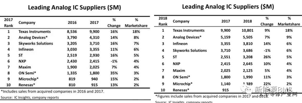 汽車電子部件上面的元件,很大比例來自于美國廠家,我們國內(nèi)的半導體產(chǎn)業(yè)仍處于發(fā)展階段;在網(wǎng)上找一張全球模擬芯片廠商排名,可以看出主要是歐美、日本企業(yè),而美國企業(yè)則過半;像TI、ADI、美信、ON等等都來自于美國。