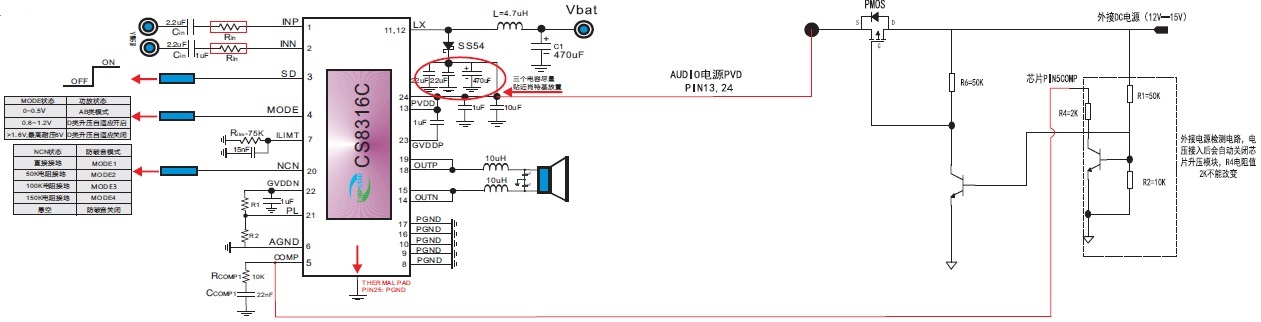 在兩節(jié)鋰電供電的拉桿音箱應(yīng)用中,普遍需要外接12V的電源,CS8316C支持兩節(jié)鋰電/12V鉛酸電池雙電源供電,推薦應(yīng)用電路圖如下: