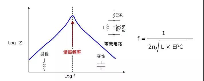 在理想電感器中,阻抗隨著頻率的提高而呈線性增加,但在實(shí)際的電感器中,如等效電路所示,并聯(lián)存在寄生電容EPC,因而會產(chǎn)生自諧振現(xiàn)象。