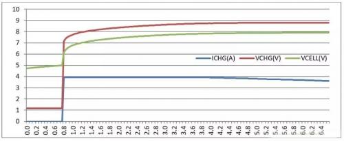 基于這個管理過程,使用充電芯片BQ24725A對一塊對講機電池(滿充電壓8.8V)進行充電,并記錄下充電過程中的VCHG, ICHG和VCELL(電芯側(cè)的電壓)。下圖所示為基于橫坐標的充電時間(分鐘)對應(yīng)的各個參數(shù)的變化趨勢,可以看到在不到第五分鐘,VCHG就達到最大值,ICHG就從峰值的4A電流開始下降,經(jīng)歷了從CC區(qū)間到CV區(qū)間的切換。最大充電速率的CC階段4A充電持續(xù)時間很短,可以預(yù)料,如果要對這塊電池完全充滿,CV區(qū)間將耗費很長的時間。