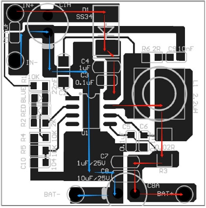 3. 如果充電電流大于1A,為了避免輸入GND走線過(guò)細(xì)的問(wèn)題,C2可以換成插件使用在BS與LX之間,以增加輸入GND的延續(xù)性。