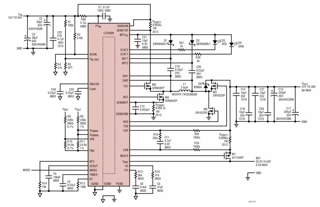 如今,人們期望電池充電器能夠容易地支持多種化學組成并接受眾多的電壓輸入,包括廣泛的太陽能電池板。輸入電壓范圍覆蓋到輸出電池電壓以上和以下的情況越來越常見,因而需要其兼具降壓和升壓能力 (降壓-升壓拓撲)。LTC4020 降壓-升壓型電源管理器和多化學組成電池充電控制器能接受 4.5V 至 55V 的寬范圍輸入,并產(chǎn)生高達 55V 的輸出電壓。其降壓-升壓型 DC/DC 控制器可向電池和系統(tǒng)提供高于、低于或等于器件輸入的電壓。