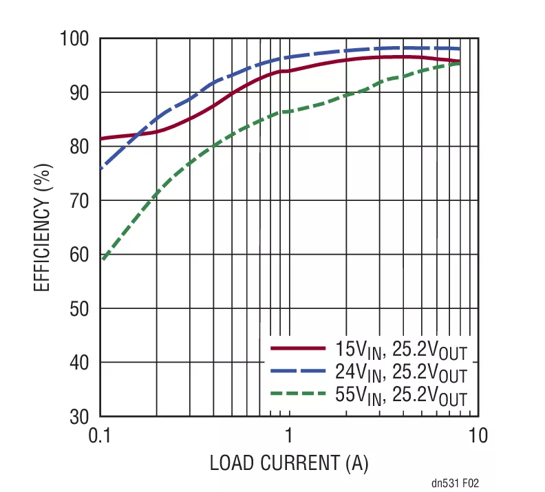 圖 2:針對圖 1 轉(zhuǎn)換器的效率與負載電流 IOUT 之關(guān)系曲線 (VOUT = 25.2V)