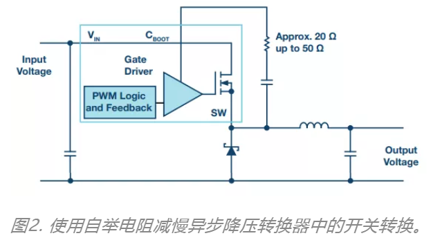 圖1顯示了快速和慢速開關(guān)轉(zhuǎn)換?焖匍_關(guān)轉(zhuǎn)換會(huì)給鄰近電路段產(chǎn)生更強(qiáng)的干擾耦合。存在電壓突變的PCB走線可與具有高阻抗的鄰近走線產(chǎn)生容性耦合。存在電流突變的PCB走線可與鄰近走線產(chǎn)生電感耦合。通過(guò)減慢開關(guān)轉(zhuǎn)換,可將這些影響降至最低。圖2顯示了一種經(jīng)驗(yàn)證適用于異步開關(guān)調(diào)節(jié)器的技術(shù)。此處,兩個(gè)開關(guān)中的一個(gè)使用了肖特基二極管。將電阻與自舉電容CBOOT(提供高邊n溝道MOSFET的柵極電壓)串聯(lián),可減慢開關(guān)的開關(guān)轉(zhuǎn)換。當(dāng)無(wú)法直接調(diào)整功率MOSFET的柵極信號(hào)線時(shí),此技巧可用于集成開關(guān)調(diào)節(jié)器。如果將開關(guān)控制器與外部MOSFET配合使用,也可將電阻插入柵極驅(qū)動(dòng)走線中。電阻值通常小于100Q。