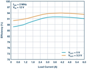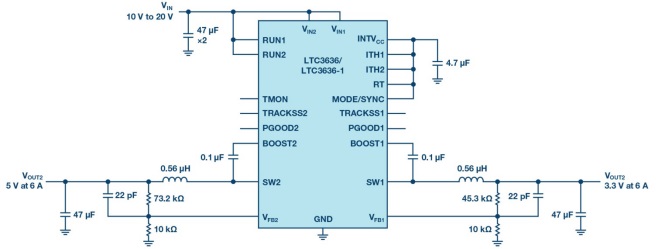 LTC3636穩(wěn)壓器具有低靜態(tài)電流,可在輸出電壓高達(dá)5 V時(shí)實(shí)現(xiàn)高效率。而LT3636-1型號(hào)將VOUT范圍擴(kuò)大至12 V。該降壓穩(wěn)壓器能夠在3.1 V至20 V的輸入電壓范圍內(nèi)工作,同時(shí)每通道提供高達(dá)6 A的輸出電流。圖3顯示的是一個(gè)高效率解決方案,而圖4顯示,其測(cè)得的效率在整個(gè)工作范圍內(nèi)一直很高。