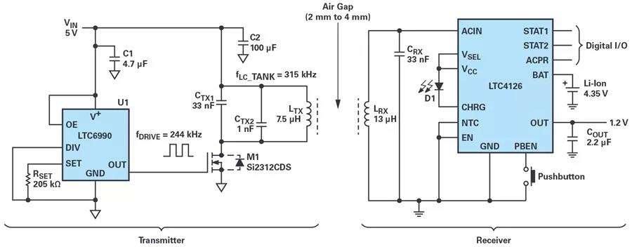 圖4. 具有單晶體管ZVS發(fā)射器和LTC4126接收器的完整無(wú)線(xiàn)充電解決方案。