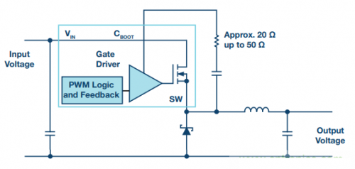 【圖2. 使用自舉電阻減慢異步降壓轉(zhuǎn)換器中的開(kāi)關(guān)轉(zhuǎn)換!