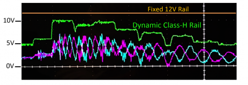 為解決以智能家居為核心的應(yīng)用問題,TI 最新的揚(yáng)聲器放大器擁有了先進(jìn)的內(nèi)置功耗管理功能。這一專有的混合調(diào)制方案可將 >12-V 系統(tǒng)中的待機(jī)電流損耗降至最低,同時采用音頻信號包絡(luò)跟蹤算法的板載 H 類升壓設(shè)置,能夠?qū)㈦姵毓╇娤到y(tǒng)的電池續(xù)航時間延長多達(dá) 40%。圖 2 說明了受算法控制的多步升壓,尤其是在播放音頻且增益較低的情況下,是如何顯著節(jié)約固定式 12V 電源軌的功耗的。