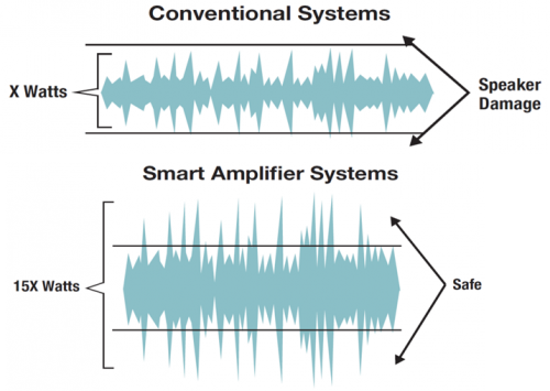 圖 3:揚(yáng)聲器保護(hù)算法使揚(yáng)聲器能夠輸出比傳統(tǒng)放大器高出兩倍的音量,同時不會損壞元器件