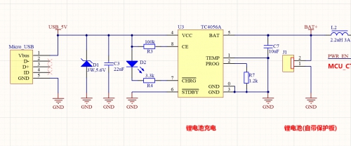 這款TC4056A也是市面上比較常見(jiàn)的一款單節(jié)鋰電池充電管理芯片,充電電壓固定在4.2V,最大充電電流可大1A,同時(shí)自帶鋰電池溫度檢測(cè)、欠壓閉鎖、自動(dòng)再充電和兩個(gè)用于指示充電、結(jié)束的LED狀態(tài)引腳。眼尖的高手們或許發(fā)現(xiàn)了筆者電路上的一個(gè)問(wèn)題,那就是,鋰電池充電部分并沒(méi)有帶保護(hù)電路,是不是有安全隱患?其實(shí)不然,因?yàn)楣P者使用的電池是鋁包電池,而非18650那種鋰電池,這種鋁包電池本身就已經(jīng)帶了保護(hù)板,所以筆者也就沒(méi)有再多此一舉了,那樣也浪費(fèi)物料。
