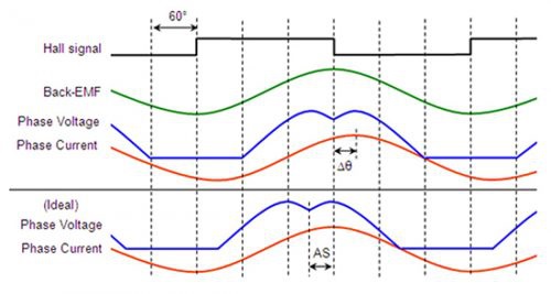 在該方案中,換向控制算法連續(xù)測(cè)量電機(jī)相電流并定期測(cè)量供電電壓。 然后,設(shè)備使用該信息計(jì)算反電動(dòng)勢(shì)和電機(jī)位置。 電機(jī)速度由單位時(shí)間內(nèi)一個(gè)相位的反電動(dòng)勢(shì)的過(guò)零次數(shù)確定。 芯片還允許超前相角,以調(diào)整相電流和反電動(dòng)勢(shì),從而實(shí)現(xiàn)最大效能。