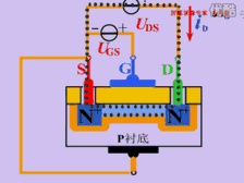 如果進一步提高UGS電壓,使UGS達(dá)到某一電壓UT時,P襯底表面層中空穴全部被排斥和耗盡,而自由電子大量地被吸引到表面層,由量變到質(zhì)變,使表面層變成了自由電子為多子的N型層,稱為“反型層”,MOS管工作原理動畫圖2—55(b)所示。