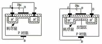 耗盡型MOS場效應(yīng)管,是在制造過程中,預(yù)先在SiO2絕緣層中摻入大量的正離子,因此,在UGS=0時,這些正離子產(chǎn)生的電場也能在P型襯底中“感應(yīng)”出足夠的電子,形成N型導(dǎo)電溝道。