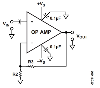 圖1中,一個(gè)電容串接在一個(gè)運(yùn)算放大器的同相(+)輸入端。這種交流耦合是隔離輸入電壓(VIN)中的直流電壓的一種簡(jiǎn)單方法,在高增益應(yīng)用中尤為有用。在增益較高時(shí),即使是放大器輸入端的一個(gè)較小直流電壓,也會(huì)影響運(yùn)放的動(dòng)態(tài)范圍,甚至可能導(dǎo)致輸出飽和。然而,容性耦合進(jìn)高阻抗輸入端而不為正輸入端中的電流提供直流路徑的做法會(huì)帶來(lái)一些問(wèn)題。