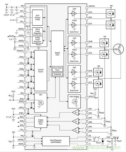 圖 3:高集成度柵極驅(qū)動(dòng)器(如 TI 的 DRV8323R)可以減少系統(tǒng)元件數(shù)量,降低成本和復(fù)雜性,同時(shí)節(jié)省空間。(圖片來源:Texas Instruments)