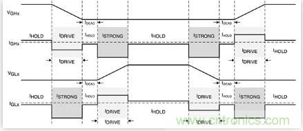 在 tDRIVE 周期之后,一個(gè)固定保持電流 (IHOLD) 會(huì)用于將柵極維持在所需狀態(tài)(上拉或下拉)。在高壓側(cè)導(dǎo)通期間,低壓側(cè) MOSFET 柵極會(huì)受到強(qiáng)力下拉,以防晶體管的柵極至源極電容發(fā)生導(dǎo)通。