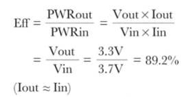 當(dāng)充滿電的鋰離子電池的起始電壓為4.2V時(shí),LDO的初始效率為78%,且其效率隨電池電壓的降低而上升。