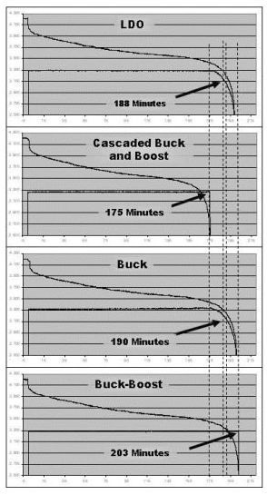 圖3為4種解決方案中鋰離子電池電壓下降到3.3V時(shí)的放電曲線與運(yùn)行時(shí)間的對(duì)應(yīng)關(guān)系。