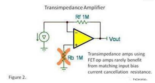 跨阻抗應(yīng)用通常利用高反饋電阻器值來(lái)對(duì)非常小的電流進(jìn)行放大處理。因此,您可能會(huì)忍不住要添加 Rb 來(lái)平衡兩個(gè)輸入端的電阻。但是,這些應(yīng)用一般使用FET 或者 CMOS 輸入運(yùn)算放大器。由于它們的輸入偏置電流非常低,因此偏移誤差一般也非常小。