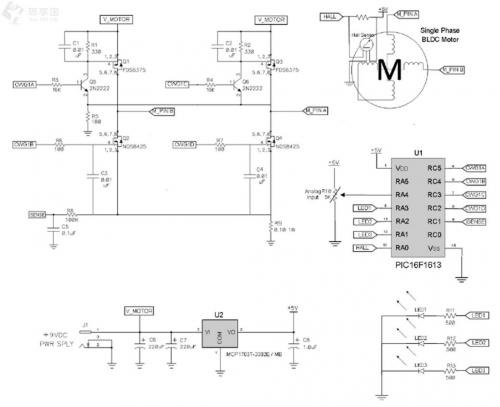 對(duì)于本設(shè)計(jì),電機(jī)額定電壓為 5V,額定轉(zhuǎn)速為 2400 轉(zhuǎn) / 分鐘。電機(jī)驅(qū)動(dòng)器電源電壓為 9V。改變 MOSFET 的額定電壓和導(dǎo)通電阻可以輕易適應(yīng)從 3.3V~100V 不同的電壓和對(duì)應(yīng)的功率等級(jí)。參考轉(zhuǎn)速可以是任一模擬輸入,比如一個(gè)電位器和固定電阻組成的分壓器,非常方便調(diào)速。PIC16F1613 單片機(jī)的 ADC 模塊具有 10 位分辨率以及最多 8 個(gè)通道,因此適用于各類模擬輸入。ADC 模塊用于提供參考轉(zhuǎn)速和初始 PWM 占空比,從而根據(jù)參考轉(zhuǎn)速源對(duì)電機(jī)轉(zhuǎn)速進(jìn)行初始化。