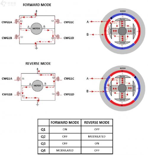 馬達(dá)驅(qū)動(dòng)就好像猴子推秋千一樣,需要在恰當(dāng)?shù)臅r(shí)候用力。霍爾傳感器負(fù)責(zé)告訴單片機(jī)何時(shí)用力。全橋驅(qū)動(dòng)就好像在左邊還有一個(gè)猴子,我們還要決定是哪邊的猴子要用力。CWG 輸出用于控制定子繞組的激勵(lì),它取決于霍爾傳感器輸出的狀態(tài)(霍爾傳感器輸出將通過(guò)比較器與 FVR 進(jìn)行比較)。將使能比較器遲滯,以屏蔽傳感器輸出中的噪聲。比較器輸出可在正向全橋模式與反向全橋模式之間切換,從而使電機(jī)實(shí)現(xiàn)順時(shí)針或逆時(shí)針旋轉(zhuǎn)。CWG 輸出將饋入全橋電路的開關(guān)的輸入。要生成一個(gè)電氣周期,必須執(zhí)行一次正反向組合。電機(jī)機(jī)械旋轉(zhuǎn)一周需要兩個(gè)電氣周期,因此必須執(zhí)行兩次正反向組合電機(jī)才能完成一次順時(shí)針旋轉(zhuǎn)。