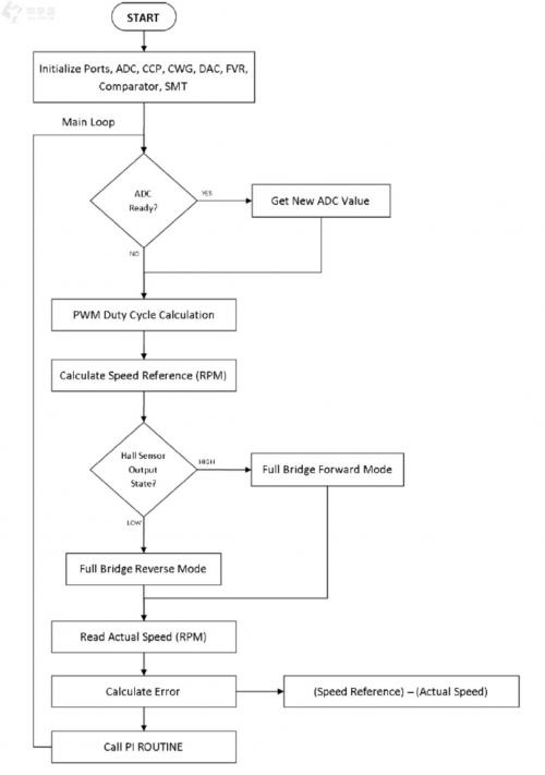 全橋電路由 CWG 輸出進(jìn)行控制驅(qū)動(dòng)電機(jī)繞組,霍爾傳感器用于確定轉(zhuǎn)子位置。流過(guò)電機(jī)繞組的電流通過(guò)檢測(cè)電阻 Rshunt 轉(zhuǎn)換為電壓,從而實(shí)現(xiàn)過(guò)流保護(hù)。轉(zhuǎn)速以外部模擬輸入作為參考。圖 2 顯示了電機(jī)驅(qū)動(dòng)器控制框圖。