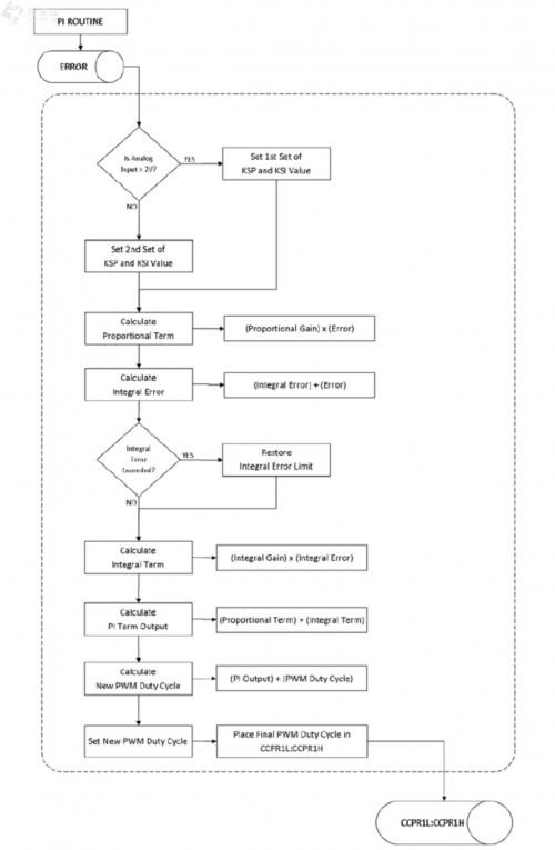 圖 2 中所示的外層回路用于控制電機(jī)在不同條件下的轉(zhuǎn)速,例如負(fù)載需求、干擾和溫度漂移變化等。轉(zhuǎn)速由 SMT 測(cè)量。SMT 是一款具有時(shí)鐘和門控邏輯的 24 位計(jì)數(shù)定時(shí)器,經(jīng)配置可用于測(cè)量多種數(shù)字信號(hào)參數(shù),如脈沖寬度、頻率、占空比以及兩輸入信號(hào)邊沿之間的時(shí)間差?赏ㄟ^(guò) SMT 的周期和占空比采集模式測(cè)量電機(jī)的輸出頻率。在此模式下,SMT 信號(hào)的占空比或周期都可基于 SMT 時(shí)鐘進(jìn)行采集。SMT 會(huì)計(jì)算單個(gè)電機(jī)旋轉(zhuǎn)周期內(nèi)的 SMT 時(shí)鐘數(shù),然后將結(jié)果存儲(chǔ)于捕捉周期寄存器中。使用該寄存器可獲得電機(jī)的實(shí)際頻率。將實(shí)際轉(zhuǎn)速與參考轉(zhuǎn)速進(jìn)行比較時(shí),如果實(shí)際轉(zhuǎn)速高于設(shè)定的參考轉(zhuǎn)速,則產(chǎn)生正誤差;如果實(shí)際轉(zhuǎn)速低于設(shè)定的參考轉(zhuǎn)速,則產(chǎn)生負(fù)誤差。此誤差會(huì)饋入 PI 控制器。PI 控制器是一種固件算法,用于計(jì)算轉(zhuǎn)速偏差的補(bǔ)償值。在初始 PWM 占空比的基礎(chǔ)上加減此補(bǔ)償值可得到新的占空比值。