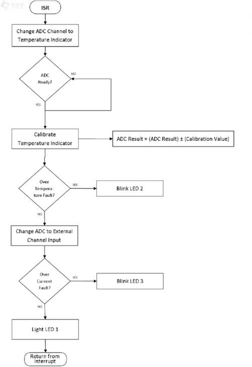 如果 Rshunt 電壓超出參考電壓,比較器輸出會(huì)觸發(fā) CWG 的自動(dòng)關(guān)斷功能,并且只要故障存在,CWG 的輸出便會(huì)保持無(wú)效狀態(tài)。過(guò)溫故障可通過(guò)器件的片上溫度指示器進(jìn)行檢測(cè),溫度指示器的測(cè)量范圍為 -40˚C 至+85˚C。指示器的內(nèi)部電路會(huì)隨著溫度的不同而產(chǎn)生不同的電壓,然后通過(guò) ADC 將此電壓轉(zhuǎn)換為數(shù)字量。為提高溫度指示器的精確度,可實(shí)施單點(diǎn)校準(zhǔn)。