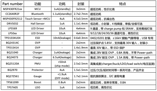 與充電盒的設(shè)計相比,耳機端的空間更小,對芯片的封裝和功耗提出了更嚴格的要求。針對這種情況,TI在耳機端的方案匯總?cè)缦拢?/font>