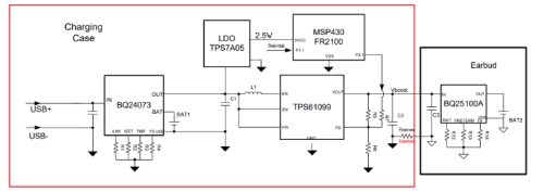 TI有一份針對TWS耳機的參考設(shè)計TIDA-050007,下圖是參考設(shè)計的系統(tǒng)框圖。這個參考設(shè)計整機功耗只有18uA,并且采用簡易算法實現(xiàn)升壓的動態(tài)調(diào)節(jié),在充電盒電池電壓高于耳機電池電壓時升壓芯片TPS61099還可以進入直通模式,使充電效率進一步提高。