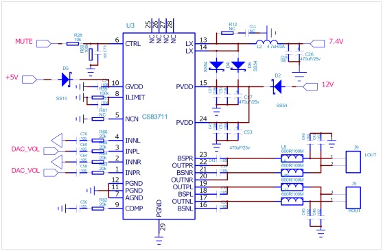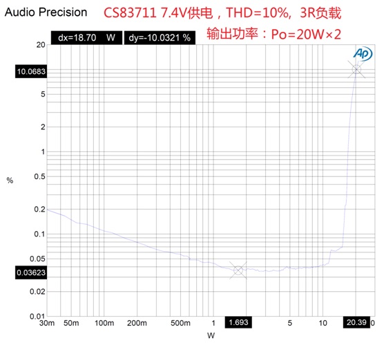 1. CS83711 7.4V供電對比普通音頻功放12V直供輸出功率,實測CS83711功率足2×20W。