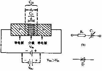變?nèi)荻䴓O管的簡化等效電路及電路符號分別如圖1(b)、(c)所示。圖中用一只可變電容來表示結(jié)電容。R2是半導(dǎo)體材料的電阻。